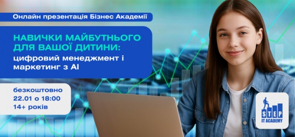 22 січня о 18:00 запрошуємо батьків та підлітків (14+ років) на БЕЗКОШТОВНУ онлайн-презентацію напрямку «Цифровий менеджмент і маркетинг з АI» від Бізнес-академії IT STEP.